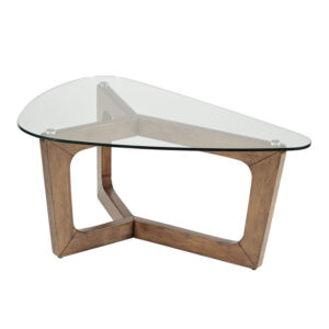 The Sammy mid-century coffee table features a striking triangle shape with a wooden base in warm pecan and a clear glass surface with smooth rounded edges. Ideal for small living rooms, this space-saving accent table balances a solid wood frame with a strong tempered surface to create a clean and airy open look. A modern…