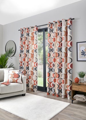 Offset circles abound in this fun screenprint-style design inspired by artwork and fashion of the 50s and 60s. The curtains are manufactured from 100% printed cotton, and are fully lined with eyelets for rail hanging.